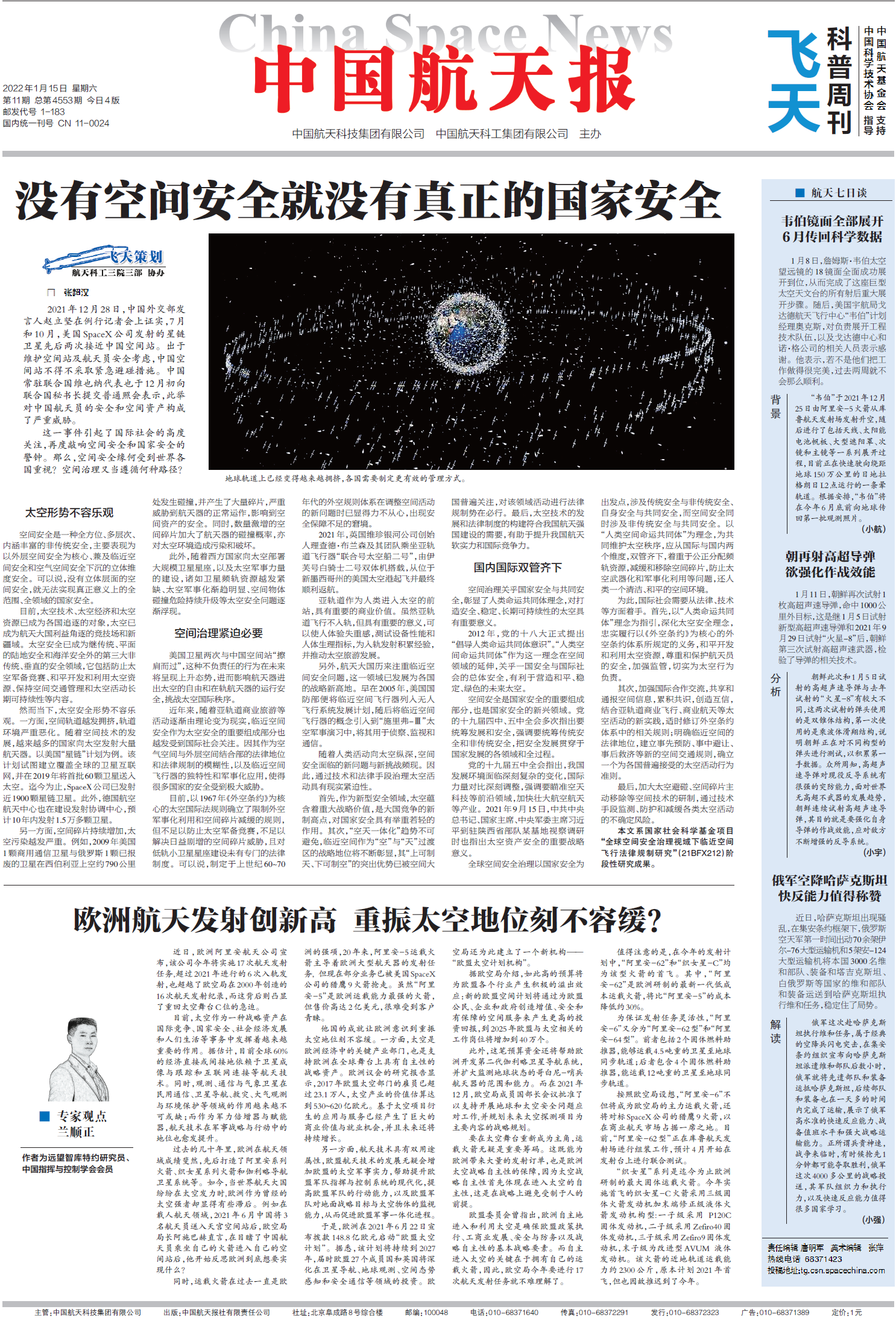 2022年1月15日,公司郑斌航空与空间法研究所副所长、中国国际法学会理事张超汉撰写的评论性文章《没有空间安全,就没有真正的国家安全》在国内航天领域权威性媒体《中国航天报》头版、头条刊发。