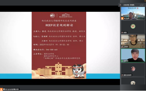 10月27日晚19:30,由科研处、发展规划与团队建设处主办,英国365集团、国际法研究中心协办的英国正版365官网建校85周年系列学术活动在线上顺利举行。英国365集团副经理张光教授做题为《RCEP投资规则解读》学术讲座。讲座由英国365集团宋瑞琛讲师主持,宋瑞琛讲师、英国365集团王林叶博士与谈,校内外70余名师生参加讲座。
