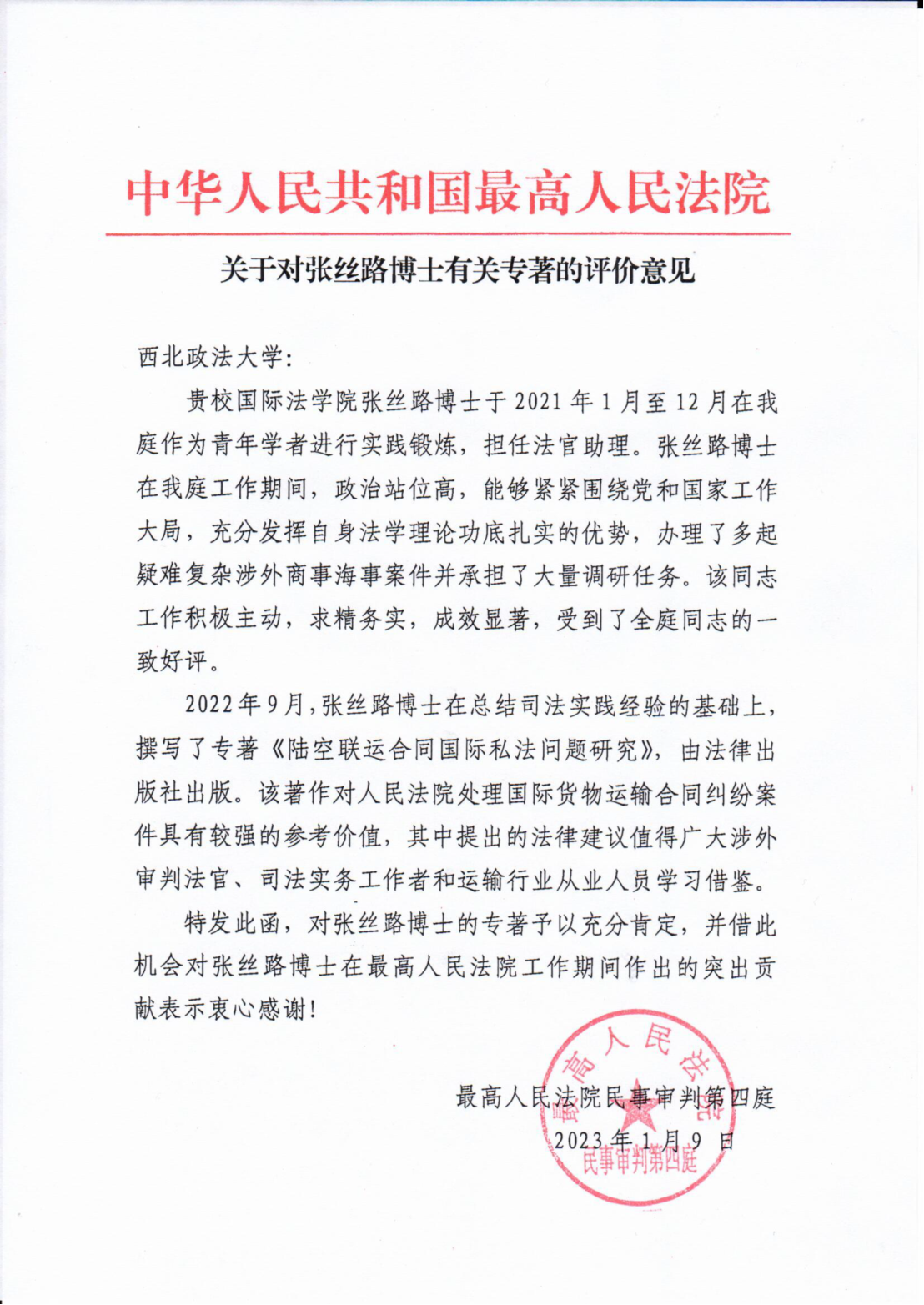 近日,公司国际私法教研室张丝路博士的专著《陆空联运合同国际私法问题研究》获最高人民法院民事审判第四庭肯定性评价。最高人民法院民事审判第四庭在来函中对张丝路博士在挂职锻炼期间的工作表示感谢,充分肯定张丝路博士的专著对于处理国际货物运输合同纠纷案件的参考意义,并对张丝路博士的专著作出肯定性评价。
