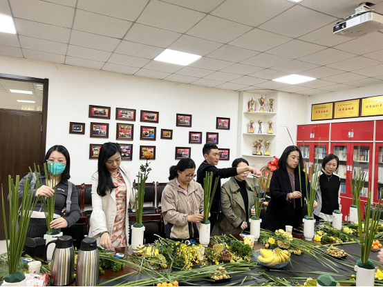 插花活动中,花艺师向各位老师讲解花瓶插花的基本技巧,从花卉的选择、颜色的搭配、花枝的修剪等方面展示了多种经典的插花造型。