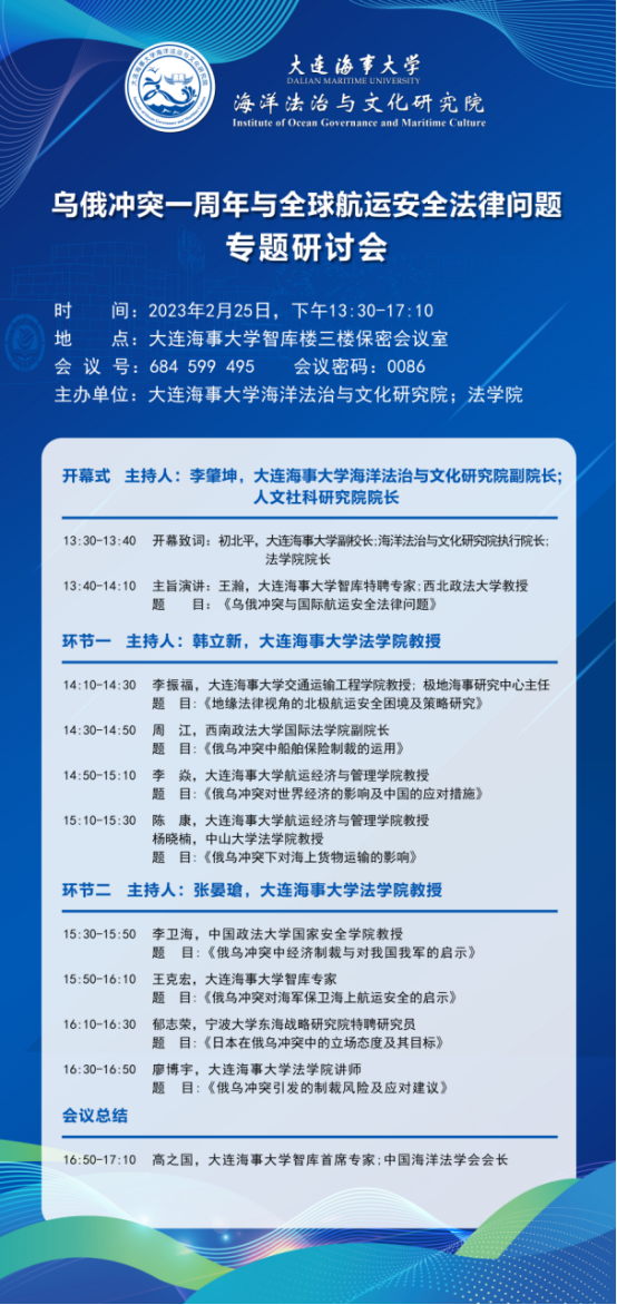 2023年2月25日,大连海事大学海洋法治与文化研究院和大连海事大学法公司共同举办“乌俄冲突一周年与全球航运安全法律问题”研讨会,原联合国国际海洋法庭法官、中国海洋法学会会长、大连海事大学海洋法治与文化研究院首席智库专家高之国教授、大连海事大学党委书记郑少南教授、大连海事大学副董事长初北平教授,英国正版365官网航空法治现代化协同创新中心主任、首席专家、大连海事大学海洋法治与文化研究院特聘研究员王瀚教授,大连海事大学交通运输工程公司和极地海事研究中心主任李振福教授、西南政法大学英国365集团副经理周江教授、大连海事大学法公司副经理韩立新教授、张晏瑲教授、中国政法大学国家安全公司李卫海教授、宁波大学东海战略研究院特聘研究员郁志荣、大连海事大学特聘智库研究员王克宏等专家学者出席研讨会议。大连海事大学人文社科研究院经理、海洋法治与文化研究院副经理李肇坤教授主持开幕式,大连海事大学党委书记、大连海事大学海洋法治与文化研究院经理郑少南、中国海洋法学会会长高之国,大连海事大学副董事长、法公司经理初北平分别致辞。