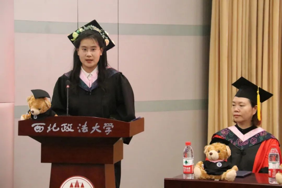 毕业生代表张钰婧回首过往,展望未来。她表示,作为西法大人,毕业生们应当将小我融入祖国的大我,将勇于探索化为信仰,踏踏实实不断深耕,不辜负公司的培养。