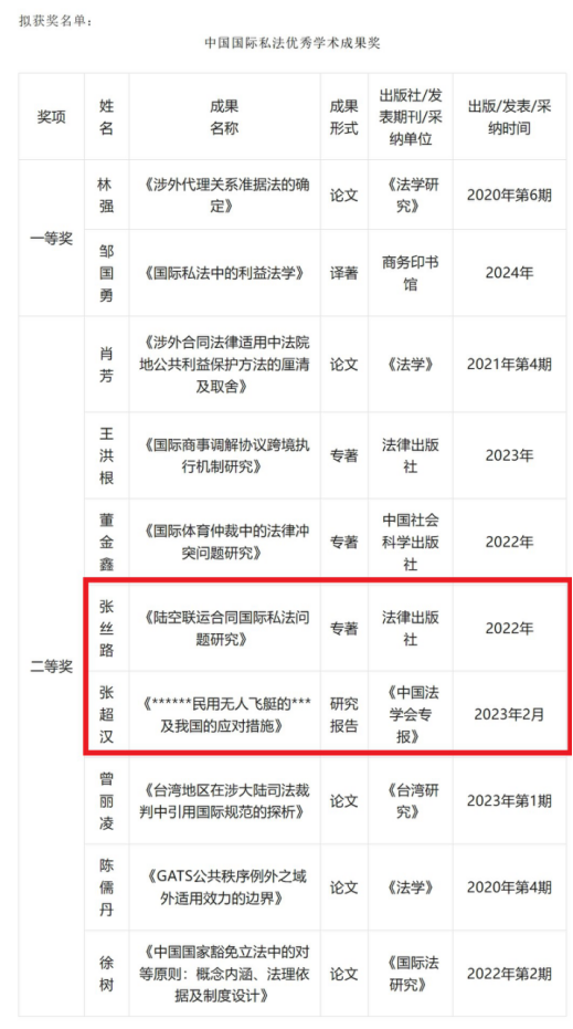 2025年3月10日,中国国际私法学会公布2024年度“中国国际私法优秀学术成果奖”“费宗祎青年国际私法学者优秀科研成果奖”获奖名单。公司张超汉教授的研究报告《******民用无人飞艇的***及我国的应对措施》、张丝路博士的专著《陆空联运合同国际私法问题研究》荣获中国国际私法优秀学术成果二等奖;博士研究生贾乔的论文《中国涉外法治的发展历程、重大贡献与实践进路》荣获费宗祎青年国际私法学者优秀科研成果二等奖。