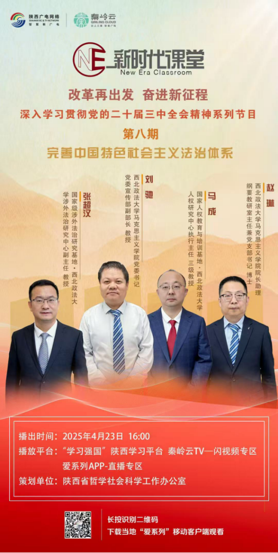 2025年4月23日下午,公司马克思主义公司党委书记、公司党委宣传部副部长刘驰教授,人权研究中心执行主任马成教授,涉外法治研究中心副主任张超汉教授,马克思主义公司经理助理赵琳博士应邀参与录制的《新时代课堂》访谈节目正式上线。