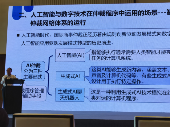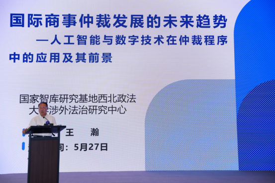 西安交通大学法公司副经理李万强教授主持主旨发言,公司王瀚教授、香港国际仲裁中心秘书长刘煦婷、西安仲裁委员会副主任兼西安仲裁院经理徐文新分别作主旨演讲。王瀚教授发表了“国际商事仲裁发展的未来趋势——人工智能与数字技术在仲裁程序中的应用与前景”的主题演讲,就“人工智能和数字技术在国际仲裁程序运用的政策导向”、“人工智能和数字技术在仲裁程序中运用的场景—仲裁网络体系的运行”和“人工智能和数字技术在仲裁程序中运用的趋势与风险控制”三个问题进行深入阐释。