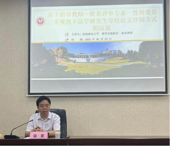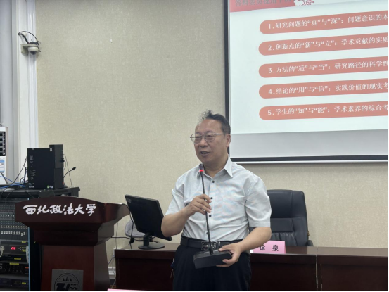王瀚教授对杨泽伟教授、徐泉教授进行介绍,并向两位专家的到来表示感谢。杨泽伟教授以《联合国对海洋法发展的影响》为题目,围绕联合国涉海职能机构、联合国推动国际海洋法律制度完善、联合国促进全球海洋治理进步三个方面就联合国对海洋法发展的影响进行梳理和讲解,认为联合国在海洋法发展中具有独特的优势,其在未来海洋法发展中作用不可替代;应进一步加强联合国涉海机构间的协调,在“国家同意原则”下实现联合国对海洋法发展的推动。徐泉教授以《基于指导教师—匿名评审专家—答辩委员三重视角下法学研究生学位论文评阅方式的反思》为题目,从指导教师、评审专家、答辩委员三个视角对法学研究生学位论文的写作和评阅进行梳理,指出严谨学术批判下存在评价维度失衡、学科视角固化、问题识别偏差以及标准适用双重性等问题,并提出制定差异化评价清单、建立“三阶”追问机制的优化路径。