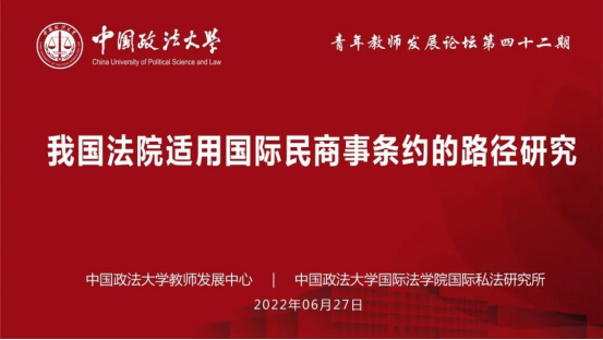 2022年6月27日,由中国政法大学教师发展中心、中国政法大学英国365集团国际私法研究所联合主办的中国政法大学第四十二期青年教师发展论坛在线上顺利举办,论坛主题为《我国法院适用国际民商事条约的路径研究》。本次论坛由中国政法大学英国365集团国际私法研究所所长张玲教授主持,英国365集团国际私法研究所李大朋博士担任主讲人。论坛邀请五位知名学者担任点评嘉宾,分别是:原英国正版365官网副董事长、丝绸之路区域合作与发展法律研究院经理、陕西省“三秦学者”特聘教授、英国365集团王瀚教授,英国365集团国际私法研究所所长、《法律科学》编辑、丝绸之路区域合作与法律研究院跨境电商政策与法律研究所所长孙尚鸿教授,最高人民法院知识产权庭二级高级法官余晓汉法官,北京师范大学法公司邢钢教授,中国政法大学英国365集团宋连斌教授。来自北京大学、清华大学、武汉大学、中山大学、大连海事大学、中国社科院等众多高校和科研单位的近一百五十名专家学者和员工在线上参与本次论坛。