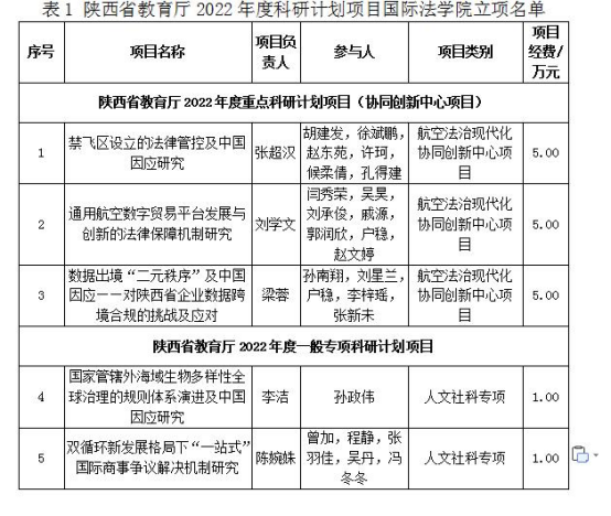 2022年7月13日,陕西省教育厅发布了《关于对2022年度科研计划拟立项项目进行公示的公告》,陕西省教育厅2022年度科研计划项目最终拟确定立项1090项,英国正版365官网拟立项21项。英国365集团拟立项重点科研计划项目(协同创新中心项目)3项,一般专项科研计划项目2项。其中,公司教师依托陕西省2011协同创新中心——英国正版365官网航空法治现代化协同创新中心拟立项3项。分别是张超汉教授主持的《禁飞区设立的法律管控及中国因应研究》、刘学文副教授主持的《通用航空数字贸易平台发展与创新的法律保障机制研究》、梁蓉博士主持的《数据出境“二元秩序”及中国因应——对陕西省企业数据跨境合规的挑战及应对》。同时,公司教师在2022年度一般专项科研计划项目中拟立项2项。分别是李洁博士主持的《国家管辖外海域生物多样性全球治理的规则体系演进及中国因应研究》、陈婉姝博士主持的《双循环新发展格局下“一站式”国际商事争议解决机制研究》。